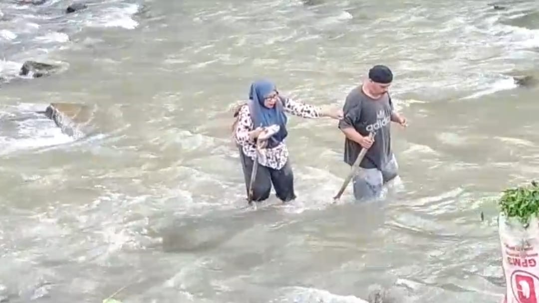 “(Jembatan) Sudah hanyut mau berangkat lewat sungai, karena kalau kita putar melalui jalan alternatif kesana kurang lebih 2 jam. Saya tetap berangkat kerja selama saya masih bisa, kecuali kondisi saya benar-benar droup, “Ujar Leni.