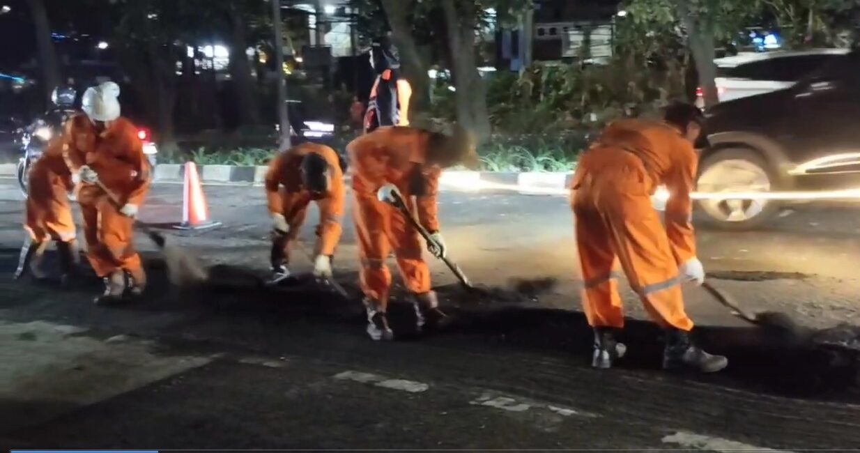 Perbaikan dilakukan pada Sabtu malam di titik jalan yang berada di depan rumah makan Gurih 7, yang diketahui memiliki permukaan jalan rusak dan kerap menyebabkan pengendara sepeda motor terjatuh.