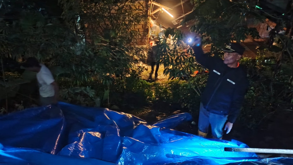 Setibanya di lokasi longsor, Camat dan tim dibantu ketua RTRW perumahan Alam Sinarsari memasang dan menutup material longsor dengan sebuah terpal berwarna biru ukuran 8 x 6 m, guna mencegah terjadinya longsor susulan.