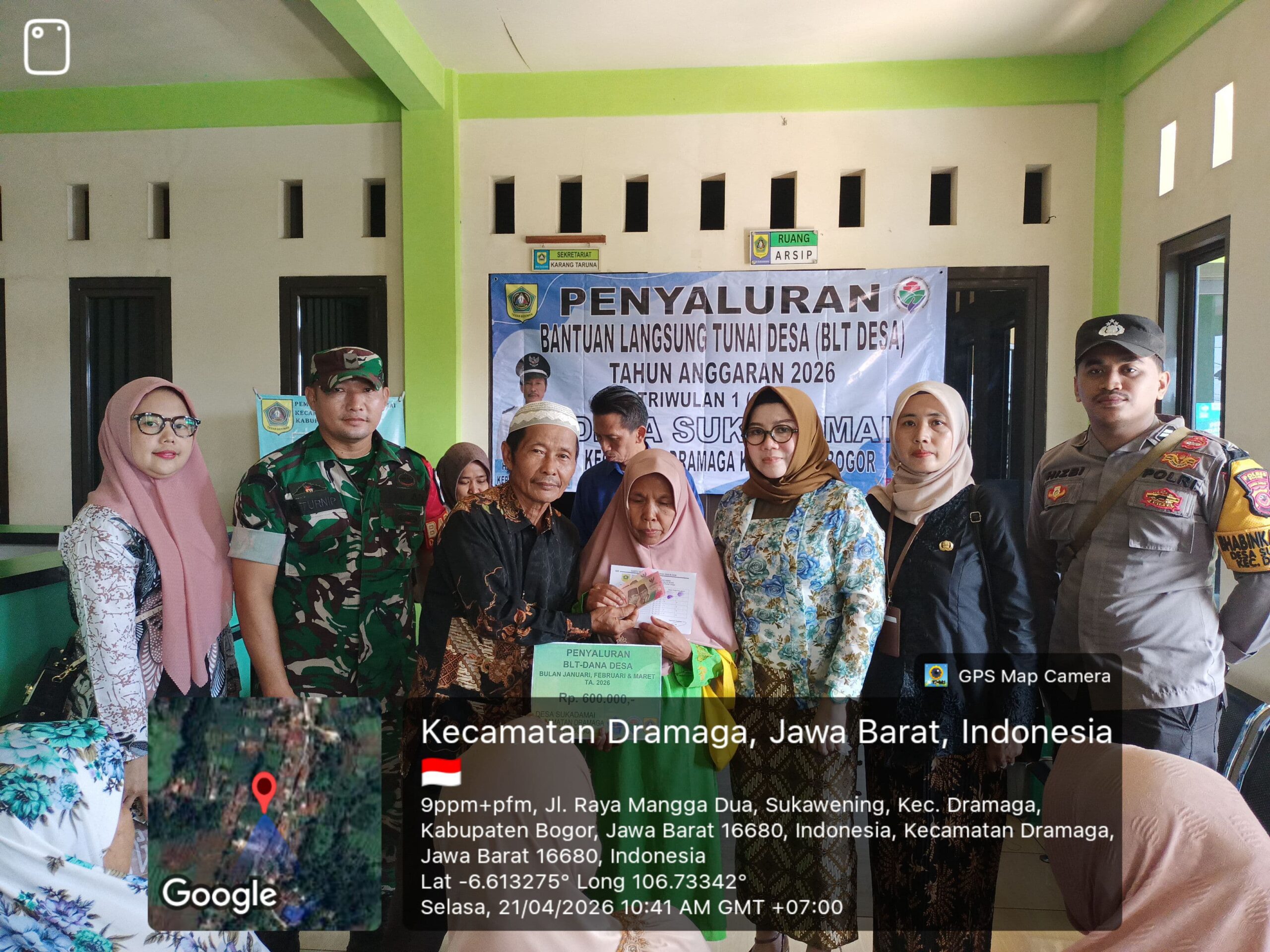Sebanyak 30 Keluarga Penerima Manfaat (KPM) menerima Bantuan Langsung Tunai Dana Desa (BLT-DD) Untuk Bulan Januari, Februari, Maret Tahun 2026 yang dilaksanakan secara langsung oleh Kepala Desa Sukdamai H. Pepen Supendi di damping babisa dan babimas . Keluarga Penerima Manfaat Desa Sukadamai kembali mendapatkan masing-masing sebesar 200.000 Per Bulannya. Selasa (21/04/2026)