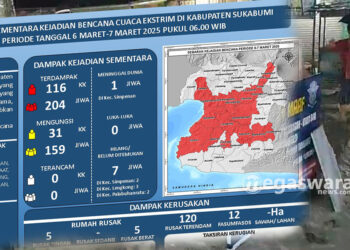 megaswaranews.com, Sukabumi Cuaca ekstrem, banjir disertakan longsor, kembali menerjang Kabupaten Sukabumi, Jawa Barat, pada 6-7 Maret 2025 menyebabkan 18 Kecamatan ...