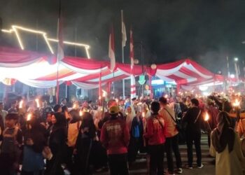 Malam Jelang HUT RI ke 80, Plaza Balaikota Sukabumi Penuh Semarak Ribuan Obor.
