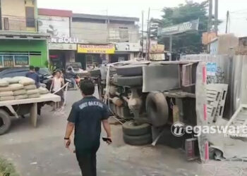 megaswaranews.com, Cileungsi – Truk engkel pengangkut semen terbalik, Setelah menyenggol pick up di jalan raya Narogong Kampung Cibeureum Desa Cileungsi ...