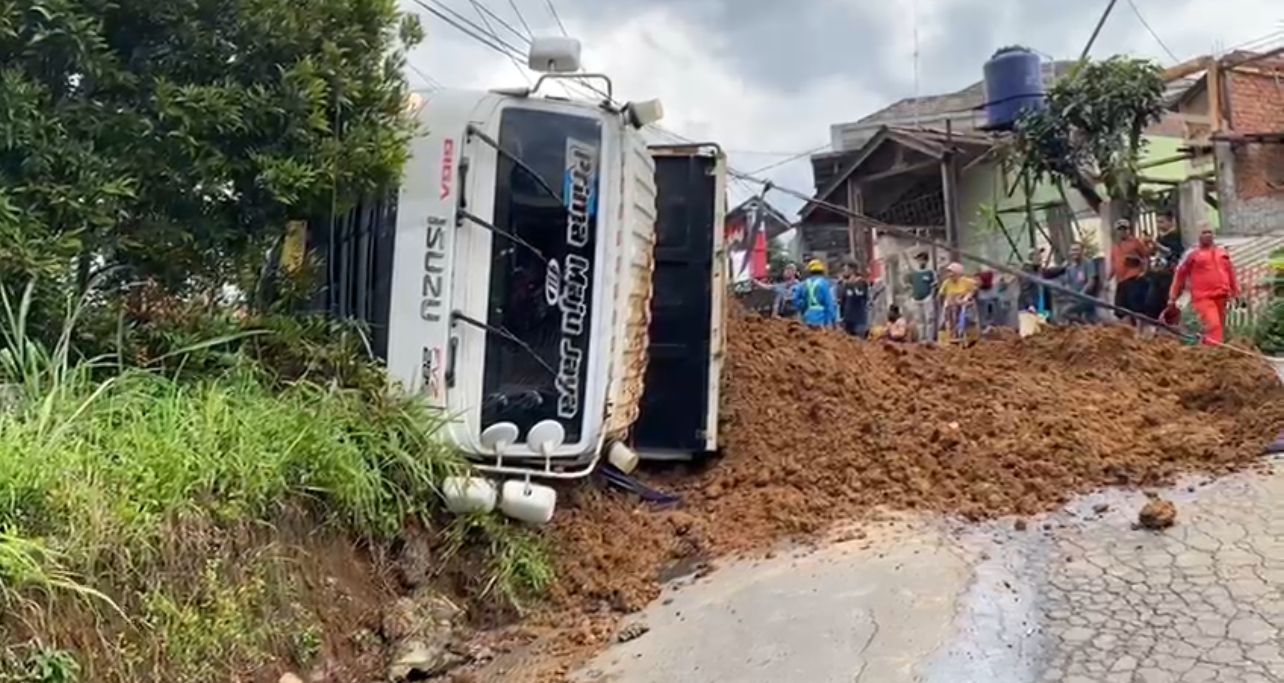 megaswaranews.com, Sukabumi — Truk bermuatan tanah yang diduga berasal dari proyek Tol Bogor, Ciawi Sukabumi (Bocimi) seksi 3 Cibadak-Sukabumi terguling di Wilayah Desa Cisaru Nagrak, Kabupaten Sukabumi, Minggu (26/10/2025) sekira pukul 15.00 WIB.