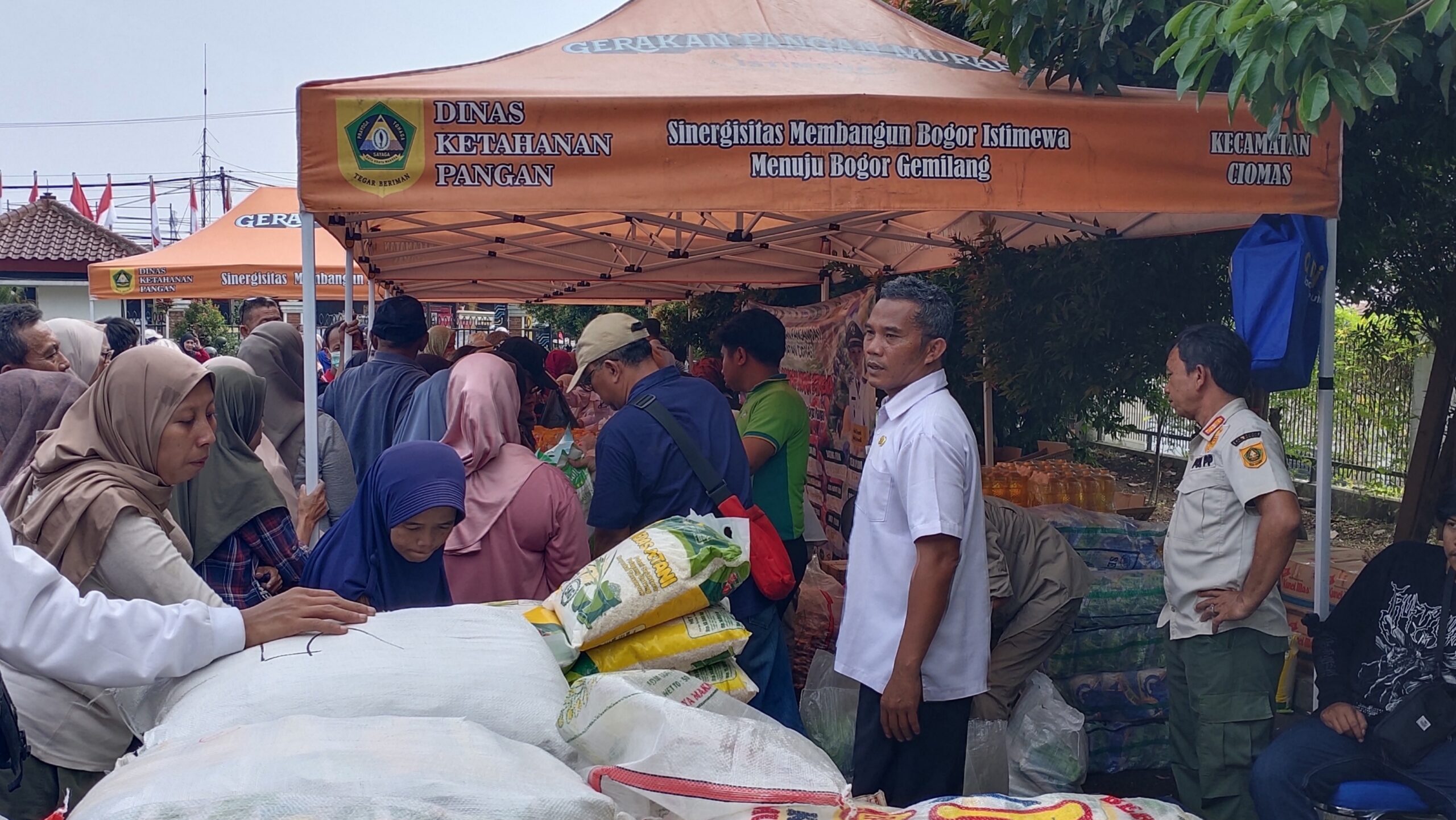 megaswaranews.com, CIOMAS – Pemerintah menggelar kegiatan Gerakan Pangan Murah (GPM) dalam rangka stabilisasi pasokan dan harga pangan di halaman Kantor Kecamatan Ciomas. Dalam kegiatan ini, panitia menyediakan berbagai kebutuhan pokok seperti beras, minyak goreng, gula, telur, bawang merah, bawang putih, dan terigu.